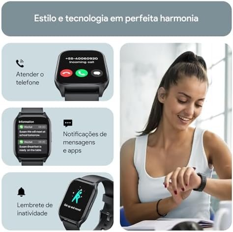 Entrega: A entrega foi padrão Amazon. Mesmo tendo uma distribuidora na cidade vizinha, demorou 5 dias para chegar. Comprei junto com outros produtos, e todos foram entregues no dia seguinte, menos o relógio, que só chegou na sexta (comprei no domingo). Achei isso bem aleatório e poderia ter vindo tudo junto.Embalagem: Veio super bem embalado, até demais. Tive dificuldade para abrir a caixa de tanta proteção, mas pelo menos chegou tudo certinho: visor lacrado, manual, cabo de carregamento e caixa intacta.Primeiro uso: Fiquei assustada porque apertei o botão para ligar e… nada. Achei que tinha vindo com defeito. Então, não faça como eu: coloque para carregar primeiro. Ele só começa a carregar depois que vibra (como explica no manual). Só depois disso liga normalmente.Carregamento: O carregamento completo levou 2 horas, dentro do esperado.Funções: Ele tem várias funções que eu nem uso, mas o que realmente me surpreendeu foi o alarme. Gostei tanto que parei de usar o alarme do celular, agora só uso o do relógio. A vibração é na medida certa: forte o suficiente para acordar, suave o bastante para não ser desconfortável. O alarme vibra bem e não assusta.Bateria: A bateria me deixou impressionada. Em 2 semanas, fiz apenas duas cargas: a inicial e outra 7 dias depois. Muito bom mesmo. Meu uso é normal, com marcação de atividades físicas.Exercícios físicos: Esse foi o ponto que menos me agradou. Comprei mais para contar calorias e distância (km), mas não supriu minhas expectativas, e eu já esperava que não fosse nível Apple Watch. As calorias ficam bem fora da realidade. Na corrida, usando Strava e relógio ao mesmo tempo, já cheguei a ter diferença de 700 metros entre os dois. Então, se o seu foco é precisão em exercícios, talvez não te agrade. Mas como ele tem outras funções que eu uso bastante, acabou valendo a pena.Ponto super positivo: variedade de atividades. O relógio oferece muitas opções de exercícios: Treino livre, Corrida ao ar livre, corrida na esteira, Caminhada, Tênis, Pedalada, Natação, entre vários outros. Para quem quer praticidade e gosta de registrar treinos de forma geral, super atende. Eu, por exemplo, uso bastante corrida,atividades livres, pedalada e tênis. Não é tão fiel, mas já ajuda na hora do treino.Bluetooth: Não uso conectado ao Bluetooth. Talvez por isso ele descarregue tão pouco e não seja tão fiel nos dados.Banho: Tomei banho com ele uma vez e continuou funcionando normalmente. Mas, por ser mais baratinho, eu não arrisco. Embora diga que é à prova d’água, prefiro evitar.Conforto no pulso: A pulseira é super confortável, bem leve e não incomoda nem no dia a dia nem para dormir. O material não esquenta e não fica “pegando” na pele. Dá para usar o dia inteiro sem nem lembrar que está no pulso. A pulseira é bem resistente e de boa qualidade, o fecho é firme e seguro. Não fica soltando e não parece que vai quebrar. É confortável ao ponto de nem sentir no braço. Ele é muito bonito pessoalmente. Fica estiloso no pulso, combina com looks casuais e até mais arrumadinhos. Passa a sensação de produto mais caro.Tela e visibilidade: A tela tem uma luminosidade ótima, inclusive ao ar livre. Dá para enxergar bem no sol e o toque responde rápido, sem travadinhas. O visor é bonito, nítido e parece até mais caro do que foi. Tem opção de diminuir o brilho, o meu fica sempre na menor intensidade, pois é bem forte. Tem várias opções de mostradores, uns bem bonitos. Dá para trocar com facilidade e deixar o relógio com a sua cara. Só achei pouca opção, e o que tem em uma não tem na outra. Ex: Uma mostra a quantidade de calorias, mas não mostra a porcentagem da bateria. Já a outra mostra a quantidade de passos mas não mostra a frequência cardíaca.Interface e facilidade de uso: Apesar de ter várias funções, é bem intuitivo. Os menus são simples, fáceis de navegar e qualquer pessoa consegue aprender em poucos minutos. Não é daqueles relógios complicados, tudo é direto, fácil e prático.Aplicativo: Quando conectado, o app é bem funcional e organizado. As configurações são rápidas, dá para personalizar algumas coisas e a sincronização funciona direitinho.Conectividade: O pareamento é rápido, sem frescura. As notificações chegam certinhas quando está conectado. Para quem usa Bluetooth, funciona muito bem.É isso, e se querem um conselho: Para quem tá com a grana apertada mas ainda sim quer se presentear ou presentear alguém, vale super apena. Fica elegante no pulso, inclusive para pulsos mais finos. Tem presença sem ser grosseiro.