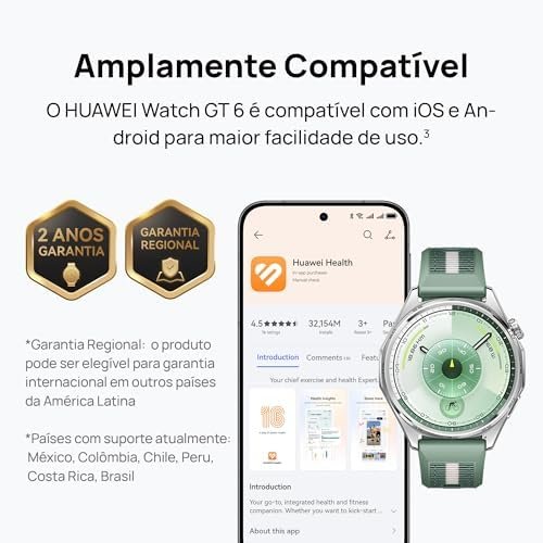 Sobre este item Bateria com autonomia de até 21 dias(1) : A carga da bateria pode durar até 21 dias, no máximo, 12 dias em uso normal, ou até 7 dias com AOD ativado, e até 40 horas no modo esportivo ao ar livre. (Circunferência do pulso: 140–210 mm) Amplamente Compatível: O HUAWEI Watch GT 6 é compatível com iOS e Android para maior facilidade de uso.(3) Potenciômetro de Ciclismo no Pulso: Pedale livre com ciência, segurança e praticidade.O HUAWEI Sunflower Positioning System atualizado alcança um aumento de 20% (4) na precisão do posicionamento por meio de aprimorados algoritmos GNSS aprimorados e arquitetura de antena. Bem-Estar Emocional Multidimensional(2): O relógio smartwatch categoriza suas emoções em 12 tipos de estados sutis em diferentes dimensões, que são visualizados em diversas formas de flores. Alimente suas sementes emocionais e deixe-as florescer.(2) Experiências Inteligentes para Uma Vida Mais Fácil: Faça e atenda chamadas via Bluetooth diretamente do seu pulso.(18) Pressione os botões Para cima e Para baixo para tirar uma foto e compartilhá-la na Galeria do seu telefone.(19) Capture uma selfie perfeita com o seu telefone, controlado diretamente do seu pulso.(20)
