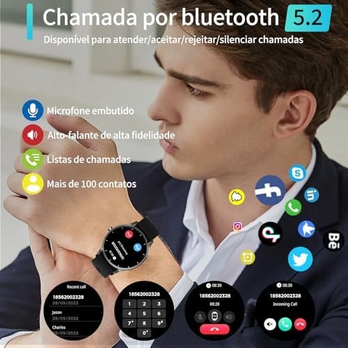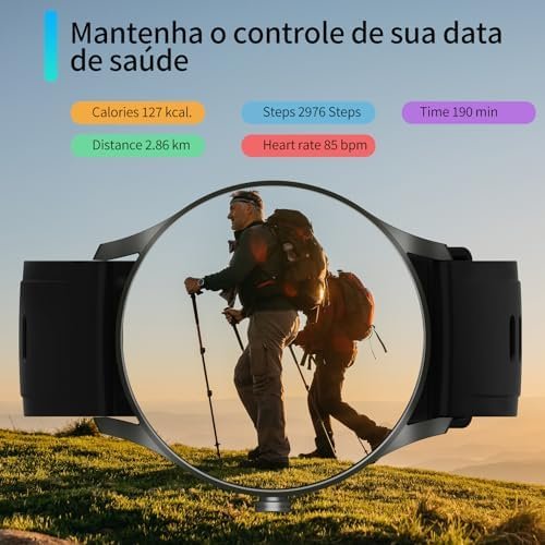 • Inclui: 1 smartwatch, 1 pulseira extra, manual de instruções multilíngue (suporta português) e 1 cabo USB de carregamento. Não possui GPS próprio; para rastrear localização, utiliza o GPS do seu smartphone conectado via Bluetooth.