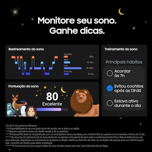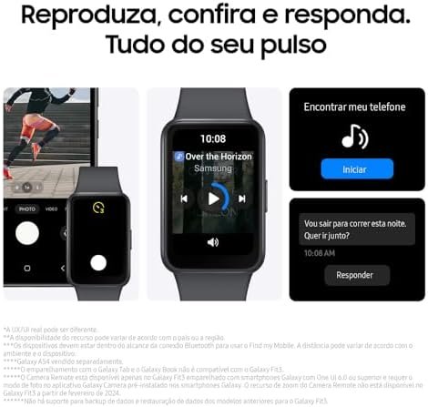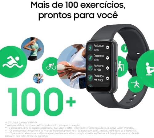 Sobre este item Para começar a usar o Galaxy Fit3, uma conta Samsung deve estar cadastrada em seu celular. Seus dados de saúde no seu Galaxy Fit3 serão transferidos com segurança e armazenados na Samsung Cloud conectada à sua conta, para que você possa acessar e gerenciar totalmente seus dados. Quando a bateria estiver completamente descarregada, o Fit não ligará. Carregue totalmente o bateria antes de ligar o Fit. A tela sensível ao toque pode funcionar mal em condições úmidas ou quando exposta à água.